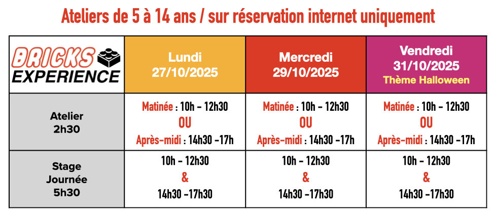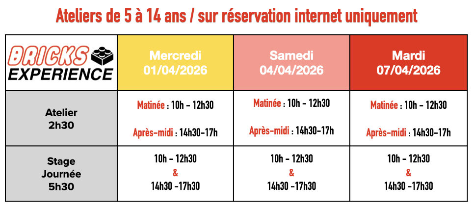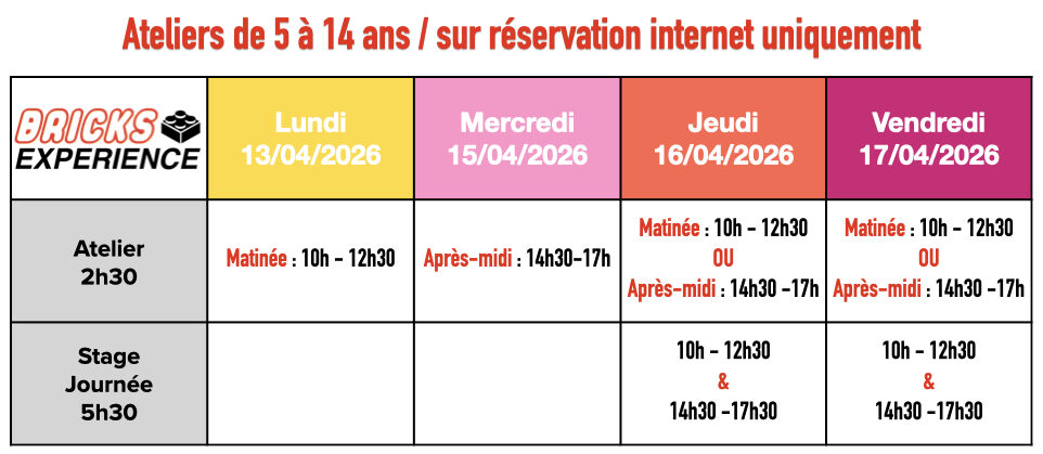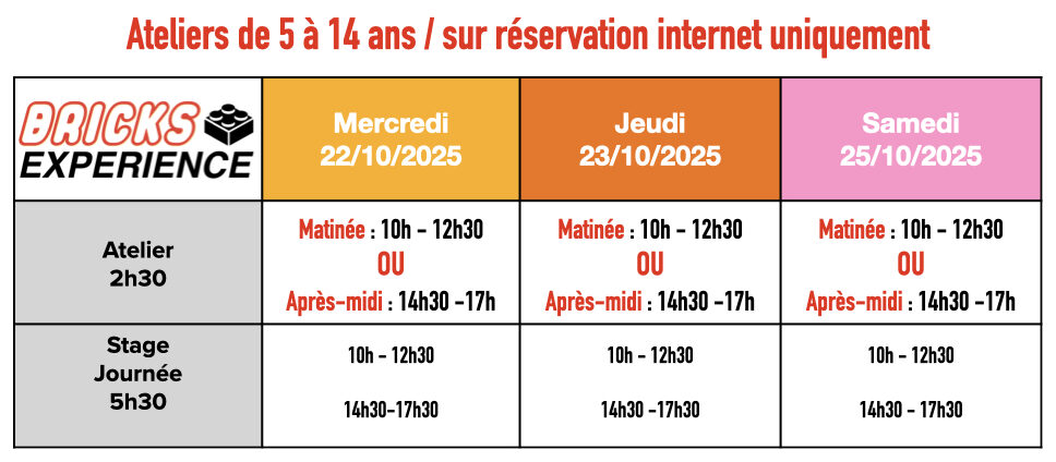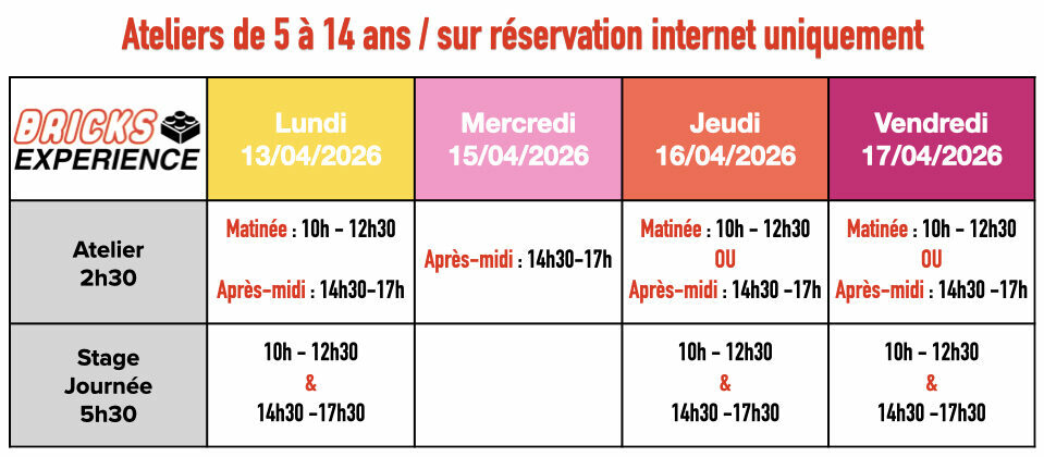 Au programme : des ateliers créatifs, des défis de construction excitants, des jeux surprenants et des activités ludiques pour émerveiller les enfants de tous âges.Chaque enfant pourra exprimer sa créativité, relever des défis en équipe et développer son imagination dans une ambiance fun et interactive.